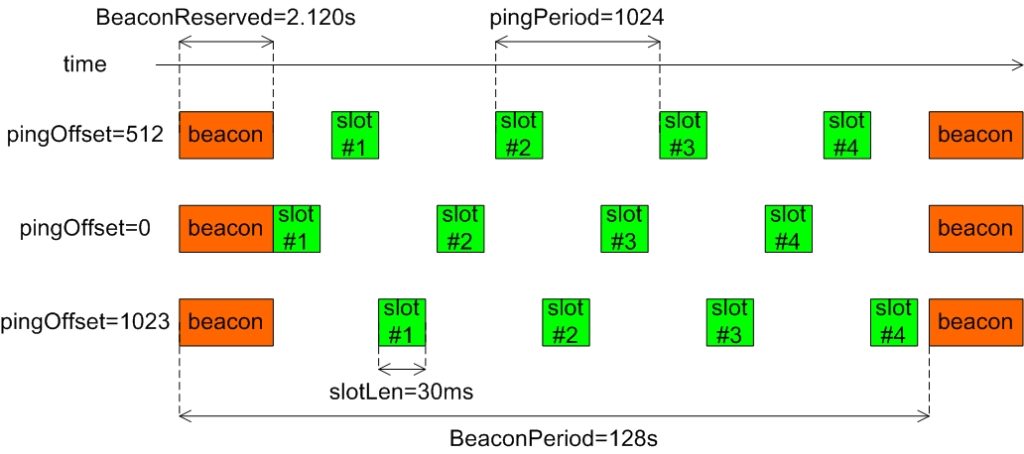 如上图所示,EndNode在一个Beacon周期开启4次ping slot,即pingPeriod=1024(时长=1024x30ms=30720ms),pingOffset每次都不一样(在3个Bacon周期中,它分别为:512、0和1023)。