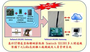 LoRa™扩频技术是指由Semtech开发专给长距离物联网使用的直接序列展频技术DSSS(Direct Sequence Spread Spectrum)。 其特点是: 1. 长距离 ~ -148dB的灵敏度提供长距离高穿透性的传输。 2. 抗干扰 ~ -20dB 的SNR提供噪声免疫能力。 3. 高容量 ~ 不同的扩频因子可以提供高频道重复使用率,容纳更多节点。 4. 低耗电 ~ 优化的省电模式可使产品使用长时间不需更换。 综合上述各点,我们便可以使用其特点来取代WiFi或是GPRS等高耗电及距离短的应用。此处介绍一使用Semtech SX1276 所开发的追踪系统,其工艺为使用LoRa传输GPS信号至网关机。在由网关机将数据传送至云端后让用户可以使用计算机或是智能手机浏览器查看信息。 应用情境:位置数据追踪 【方案方块图】 【系统功能】 Gateway 1).Transceiver SEMTECH SX1276 2).MCU TI AM3352 3).Voltage DC 9V~48V 4).Power Consumption Max. 7.2W 5).Frequency Range 902~928MHz 6).Frequency Accuracy ±1KHz 7).Modulation LoRa (Spreading spectrum) 8).Transmission […] Read more.